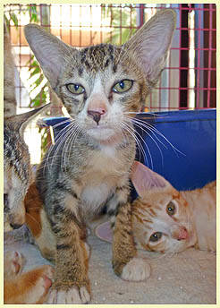 I arrived at the DRCS together with at least seven other little kittens. I'm not even sure where they all came from and why we all landed up in the same cage outside the shelter. Some of them are family, this I know. But some of them look so alike that I got confused. We were told that some nice Thai man saved us from death by bringing us in. Once at the DRCS we were dewormed and received the necessary treatment. Thankfully that annoying worm-belly has disappeared! A couple of us have already found a new home and I keep praying that I will be the next!